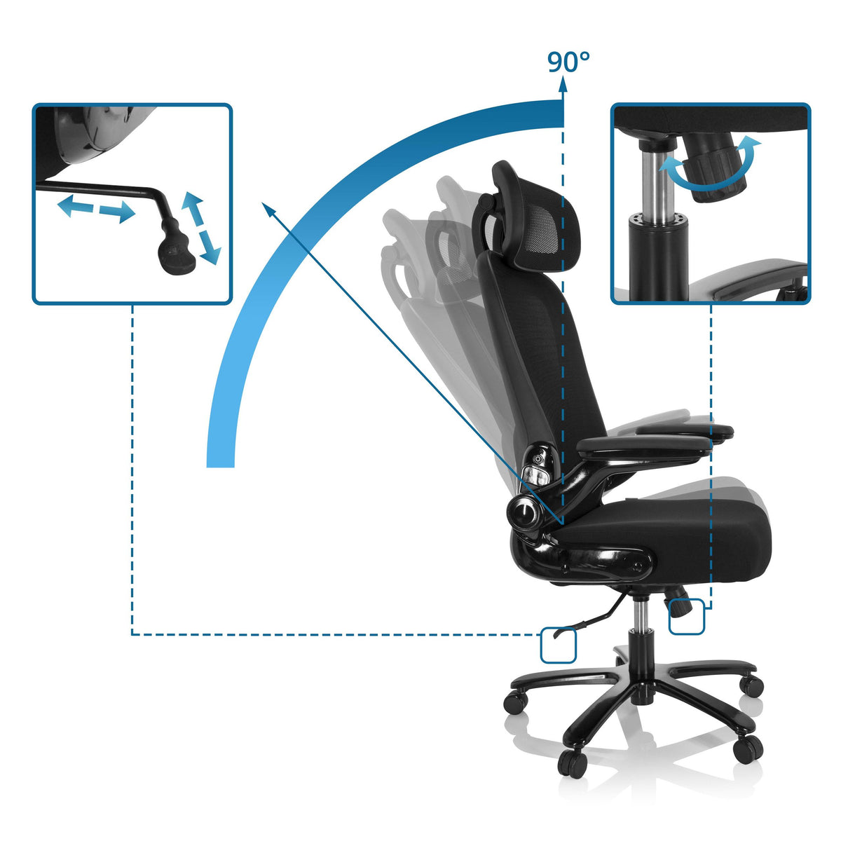 Atzveltnes pretestības mehānismu var individuāli pielāgot lietotāja svaram, izmantojot grozāmu pogu zem sēdekļa, un to var nofiksēt vertikālā stāvoklī.