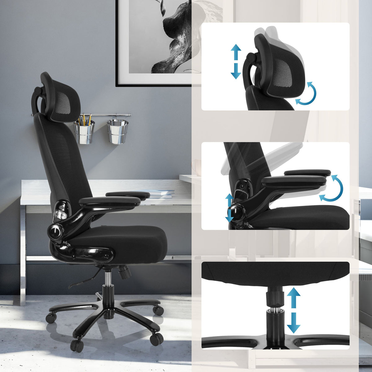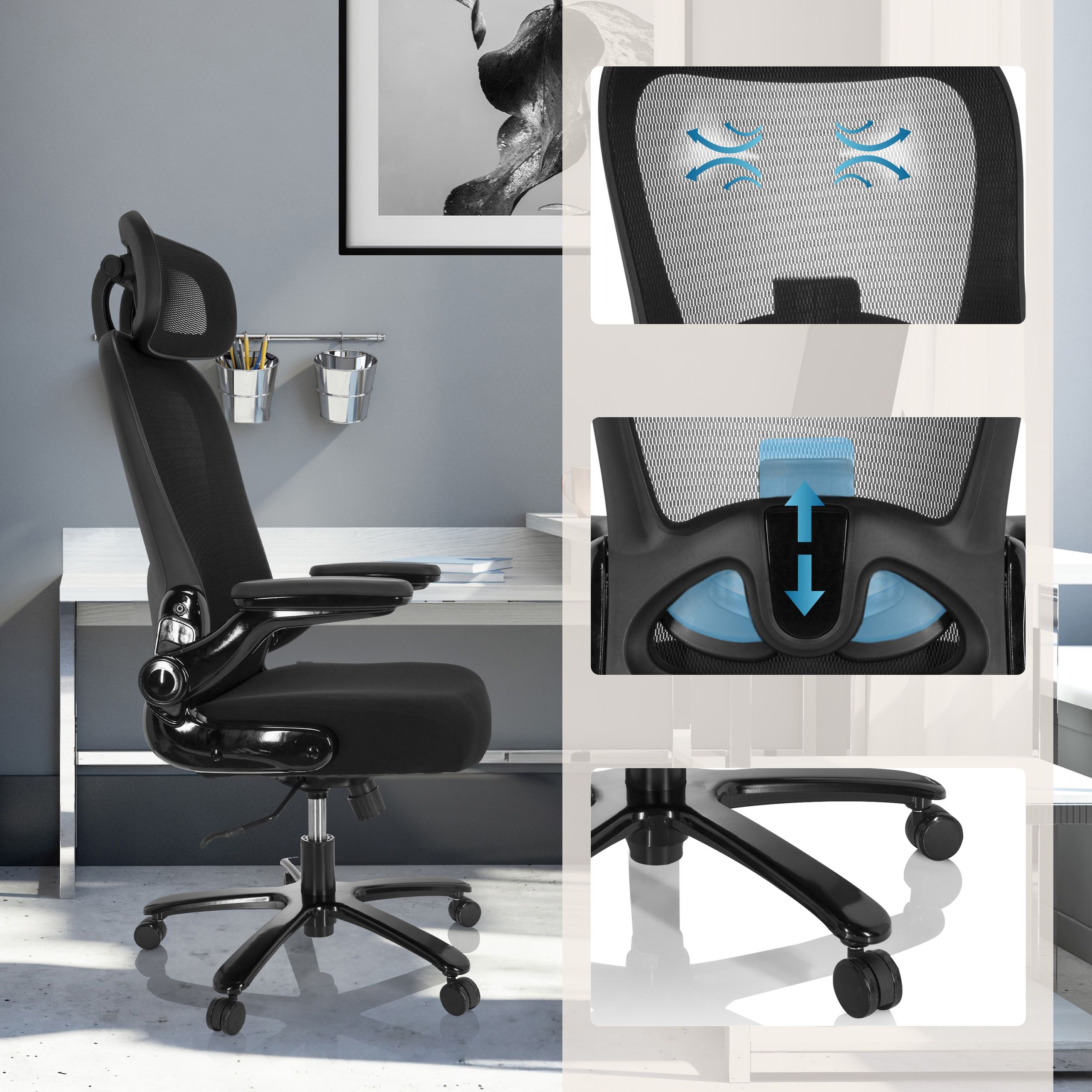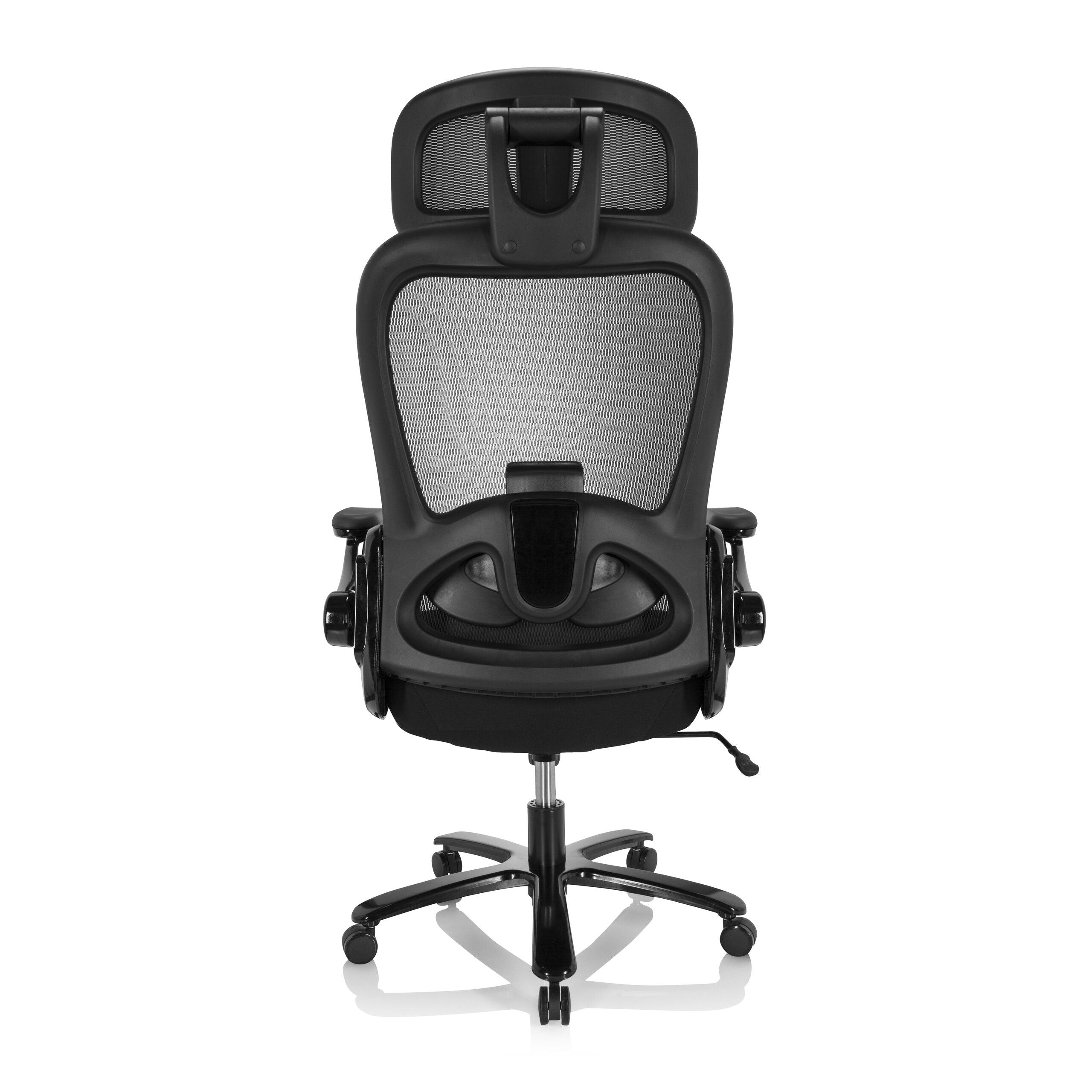 Augsta atzveltne ar elpojošu sieta pārvalku.