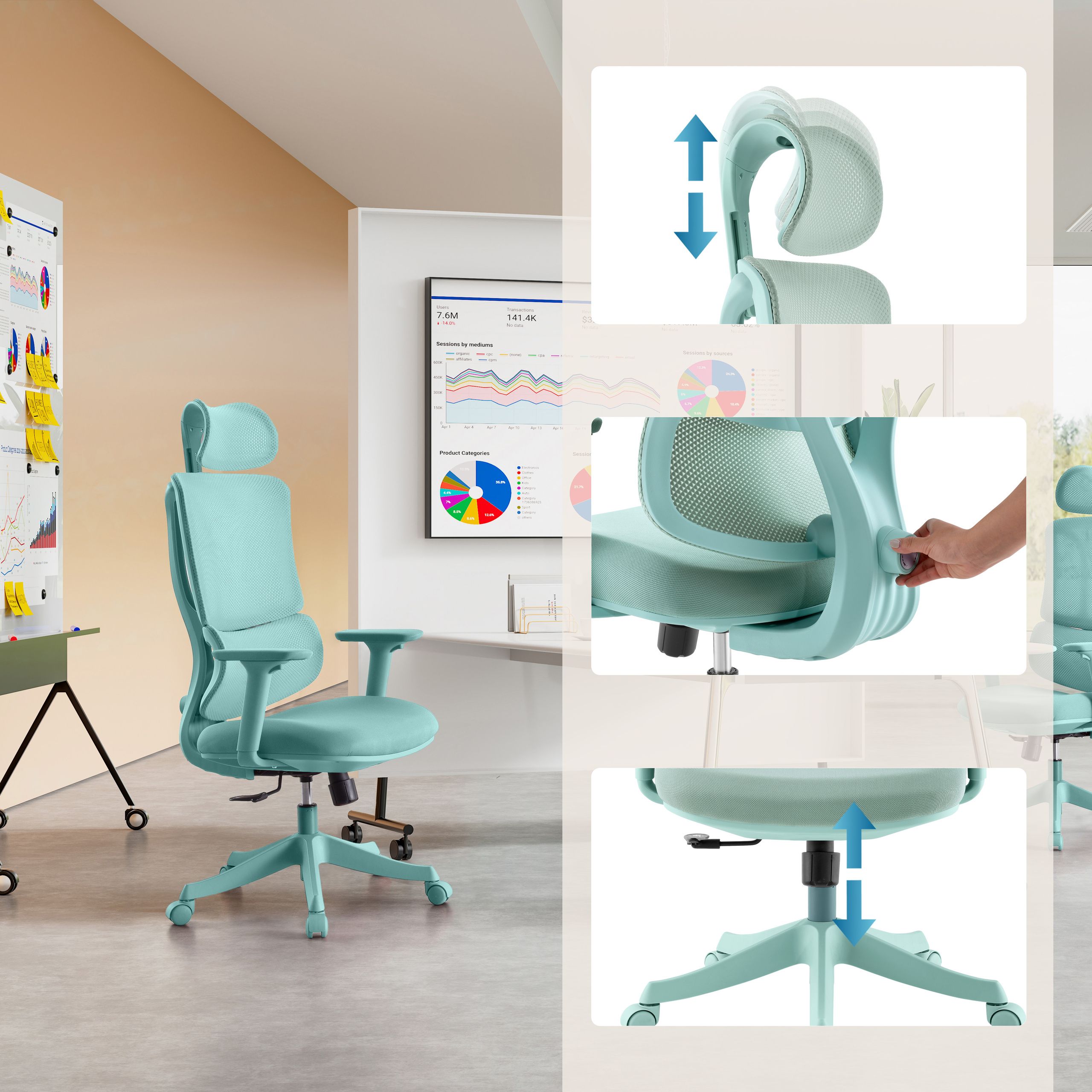 No elpojoša tīklveida auduma izgatavotā atzveltne nodrošina labu ventilāciju un novērš svīšanu pat garu darba sesiju laikā. Dziļumā regulējamais jostasvietas balsts nodrošina atbalstu muguras lejasdaļai un veicina veselīgu sēdēšanas pozu. Augstumā regulējamie roku balsti ļauj individuāli pielāgoties ķermeņa augstumam un veicina ergonomisku roku un plecu novietojumu. Augstumā regulējamais galvas balsts papildina kopējo dizainu un nodrošina optimālu atbalstu kakla un galvas zonai.