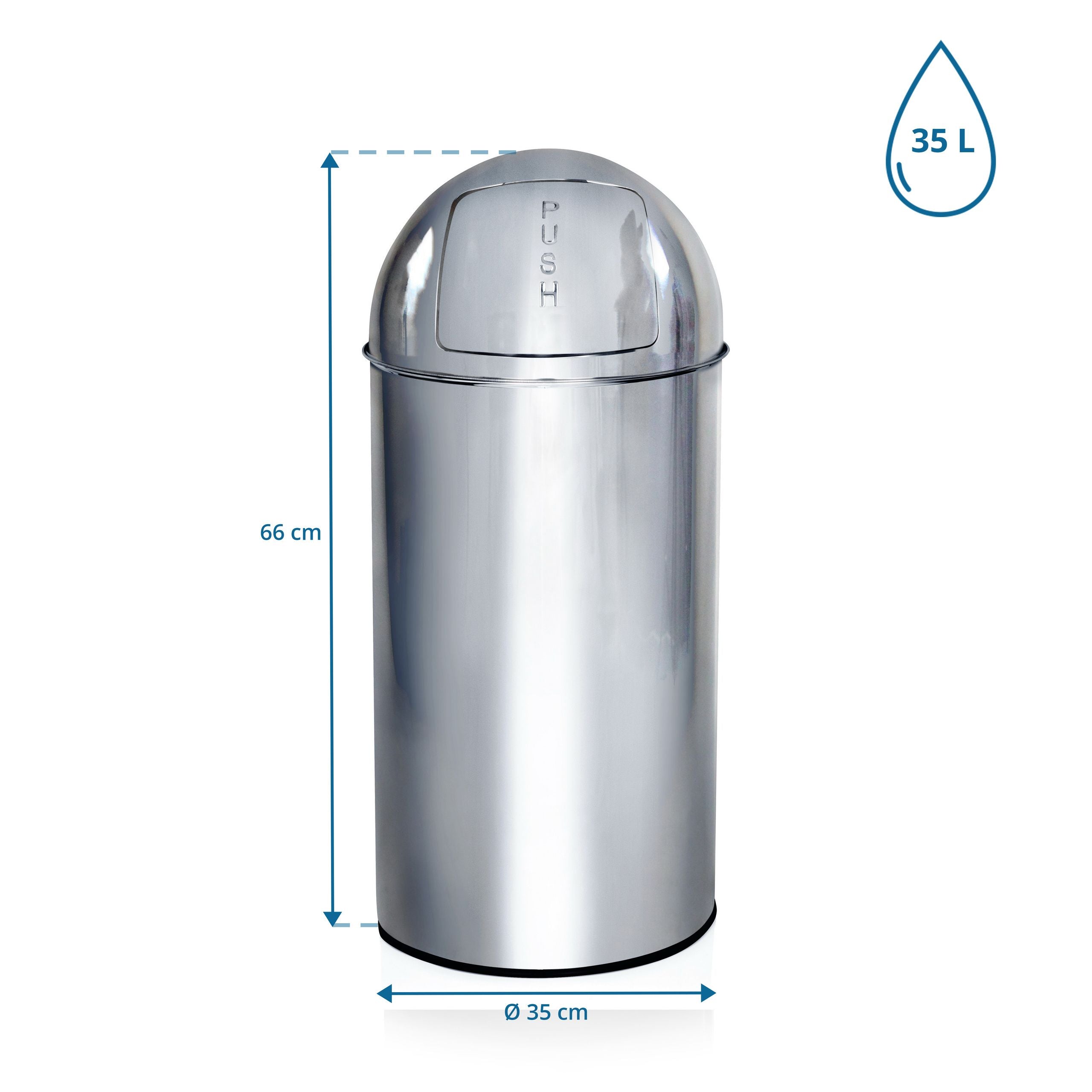 PUSH 35L simbolizē kārtību un tīrību, un tā ir ideāli piemērota ikdienas lietošanai telpās. Izgatavota no lokšņu tērauda, šī atkritumu tvertne ir īpaši viegli tīrāma, pateicoties tās izturīgajam materiālam. Iekšējais spainis ar praktisku skavas gredzenu atkritumu maisiem ir 35 litru ietilpīgs un piedāvā plašu vietu. Aizsargājiet vidi un veiciniet atkritumu šķirošanu ar PUSH 35L.