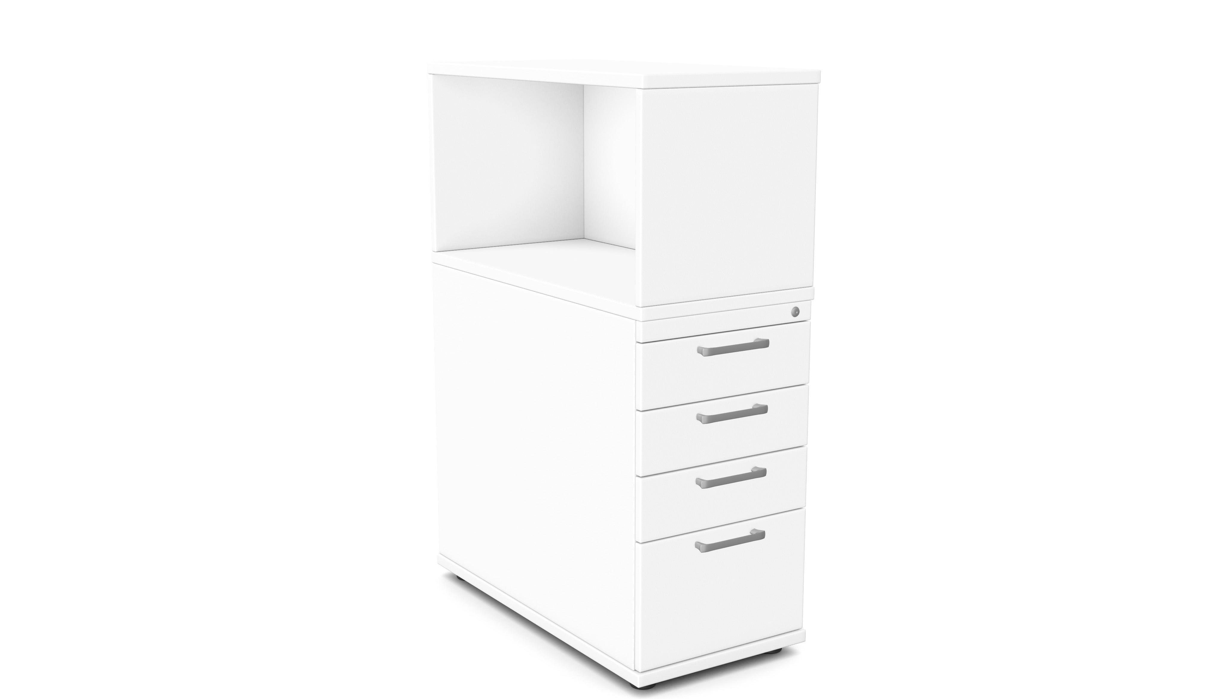 Aprīkots ar 4 ietilpīgām atvilktnēm un plauktu, kuram iespējams montāžas laikā mainīt atvēruma pusi.