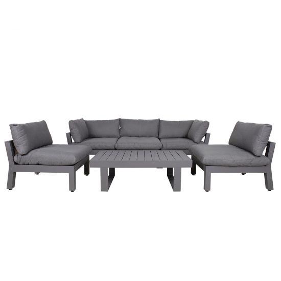 Dārza mēbeļu komplekts FLUFFY moduļu dīvāns, galds un divi krēsli, pelēks. Kafijas galdiņš 133x73,5xH42cm, galda virsma un rāmis: tumši pelēks alumīnijs. Komplektā ietilpst 2 stūra moduļi (13792) 93x93xH66cm un 3 vidus moduļi bez roku balsta (13793) 82x93xH66cm. Dīvāna moduļi ir izgatavoti no alumīnija un pārklāti ar tumši pelēku pulverkrāsu. Komplektā ietilpst spilveni. Spilvenu audums: tumši pelēks poliestera audums. Dīvāna moduļus iespējams novietot dažādos veidos, kā arī iespējams izmantot kā atsevišķas sēdvietas.
