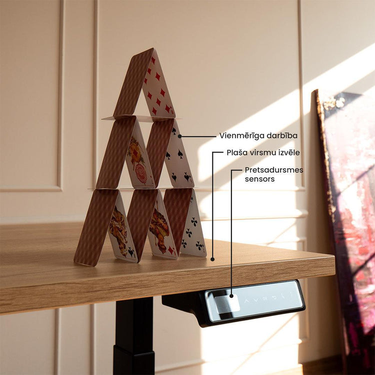 Galda rāmis ir aprīkots ar pretsadures mehānismu- sešu asu elektronisku žiroskopu, kas nosaka šķēršļus, kad galds tiek nolaists vai pacelts, un aptur rāmja kustību, lai novērstu iespējamas sadursmes. Šī funkcija ir īpaši svarīga, ja galdu iegādājaties home- office aprīkošanai,